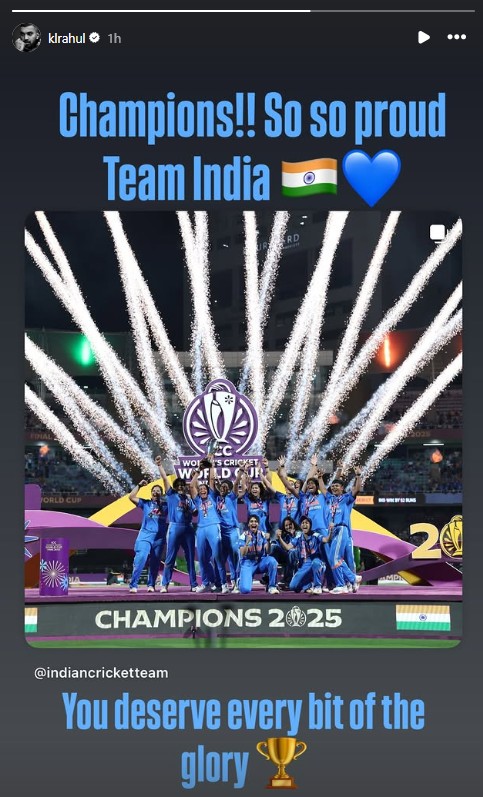 Team India middle-order batter KL Rahul took to Instagram and posted a picture of the Harmanpreet Kaur-led side with a caption, "Champions!! So so proud Team India. You deserve every bit of the glory."