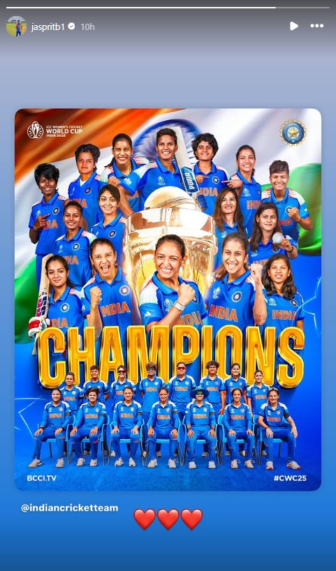 Mem in Blue speedster Jasprit Bumrah also took to Instagram and posted a picture of the Indian Women's Cricket Team with "Champions" written on it.